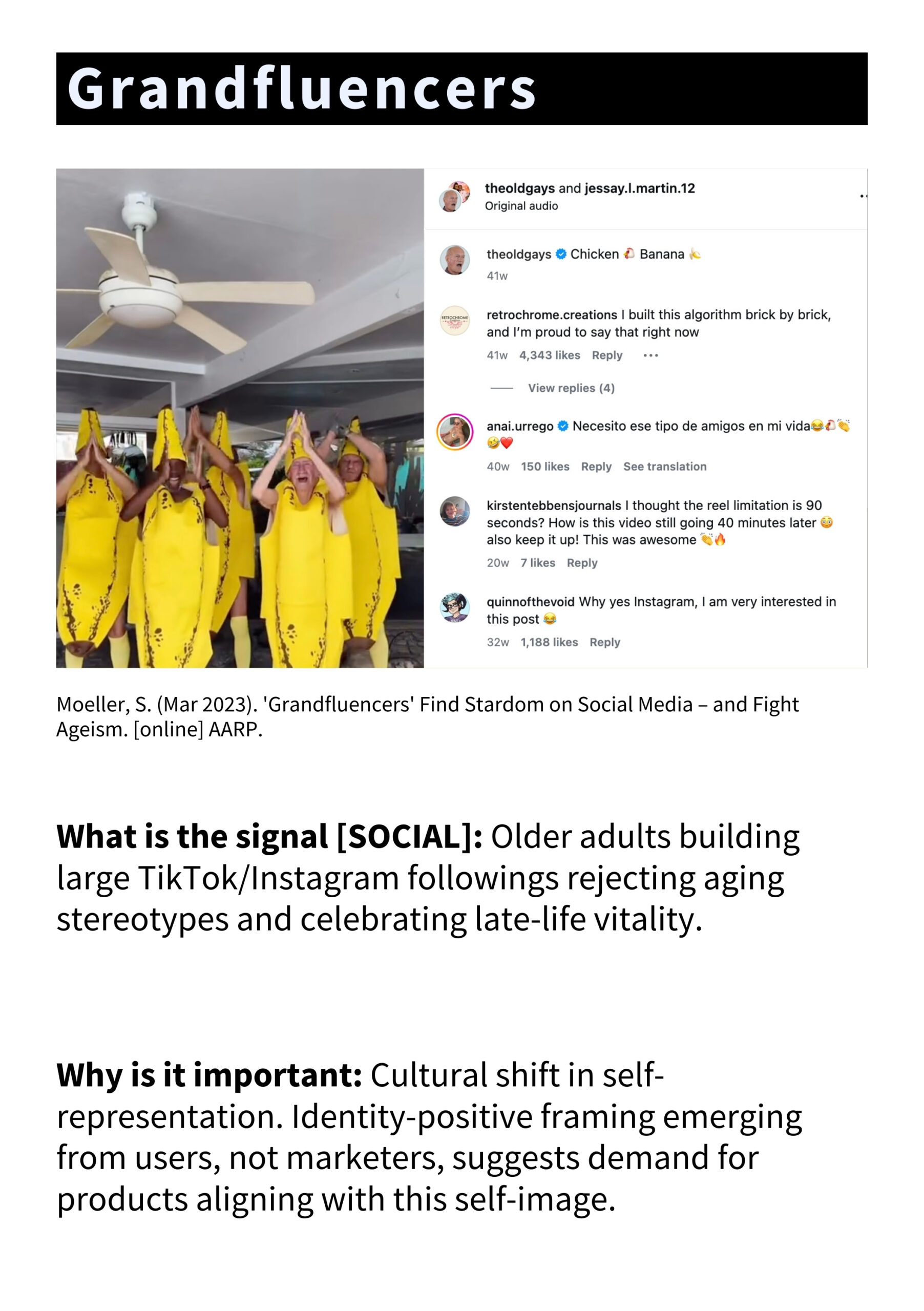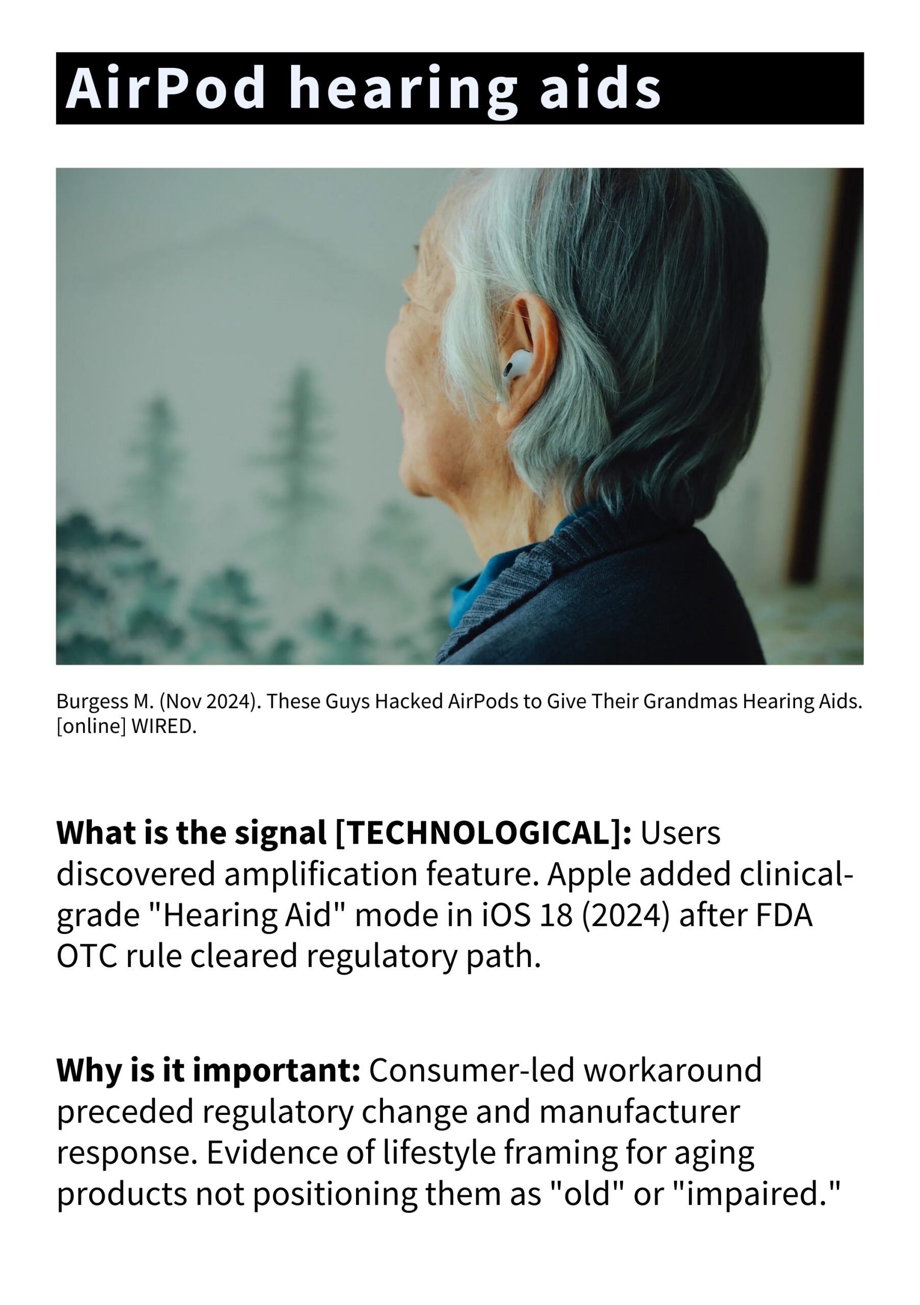 • Signal database: tracking emerging shifts in aging product adoption, identity, and market behavior